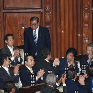 10月1日,在位于日本东京的日本国会众议院举行的首相指名选举中,石破茂起身致谢。(图源:新华社)
