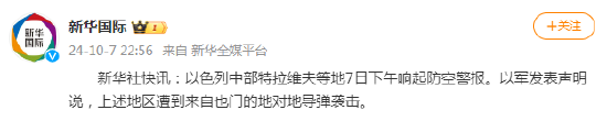 新华社快讯:以色列中部特拉维夫等地7日下午响起防空警报。以军发表声明说,上述地区遭到来自也门的地对地导弹袭击。