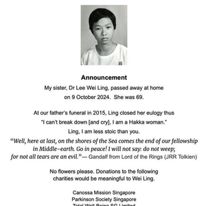 新加坡已故建国总理李光耀之子李显扬10月9日在社交媒体平台Facebook发布讣告,宣布其姐姐李玮玲当日在家中去世,终年69岁。讣告提到,将很快公布葬礼细节。