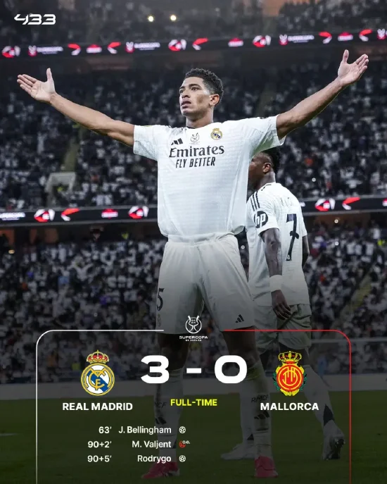 西班牙超级杯半决赛,皇马3-0击败马洛卡,晋级决赛,将与巴萨争夺冠军!贝林厄姆首开纪录,迪亚斯造乌龙,罗德里戈锦上添花。