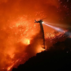 当地时间1月11日,美国加州山火持续,消防直升机进行灭火。(视觉中国)
