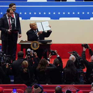 1月20日,在美国首都华盛顿第一资本体育馆,美国总统特朗普展示其签署的行政令。新华社记者吴晓凌摄