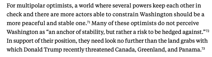 《2025年慕尼黑安全报告》的作者们写道,来自华盛顿方面的信号越来越明显,即美国不再想成为自由国际秩序的守护者,特朗普提出的“土地掠夺”威胁,意味着美国本身已经成为其他国家需要对冲的风险。