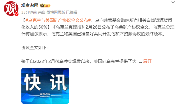 [乌克兰与美国矿产协议全文公布,乌向共管基金缴纳所有相关自然资源货币化收入的50%]《乌克兰真理报》2月26日公布了乌美矿产协议全文,乌克兰总理什梅加尔表示,乌克兰和美国已准备好共同开发乌矿产资源协议的最终版本。