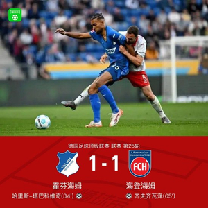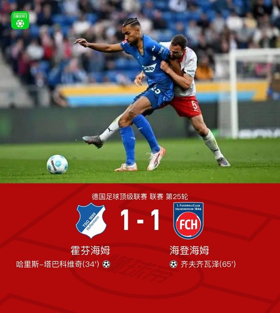 北京时间3月10日,德国足球甲级联赛第25轮,霍芬海姆主场迎战海登海姆。比赛中,霍芬海姆凭借哈里斯-塔巴科维奇的进球取得领先。随后,海登海姆由齐夫齐瓦泽扳平比分。最终,双方以1-1握手言和。