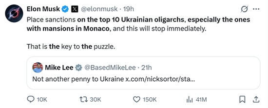 周日,在回应共和党参议员迈克·李呼吁削减对乌克兰援助资金的帖子时,马斯克提议制裁乌克兰寡头。