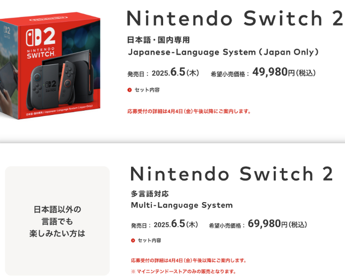 发布会结束后,任天堂在官网宣布,Switch 2会有一个“日本特供款”,定价为49980日元(约合人民币2413元),系统只支持日语,以及日区任天堂账号。与此同时,还有一款多语言版本的Switch 2,定价为69980日元(约合人民币3387元),这也是海外发行的参考价。