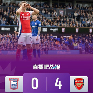 全场比赛结束,阿森纳客场4-0击败伊普斯维奇。