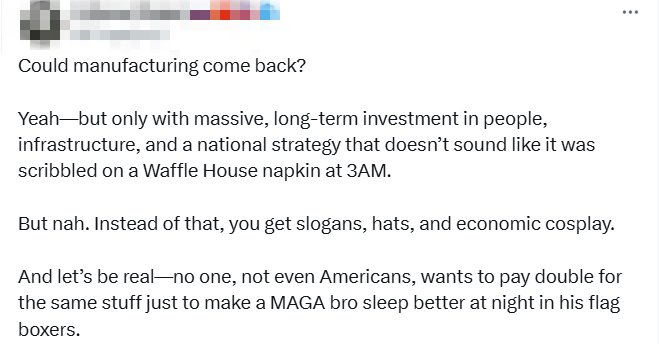 不过,一名网友的反驳直击要害:“制造业能够回流美国吗?能——但前提是要在人力、基础设施方面进行大规模的长期投资,并且要有一套像样的国家战略,而不是那种听起来像是凌晨三点在华夫饼屋的餐巾纸上匆匆写就的计划。”