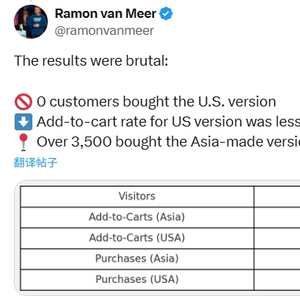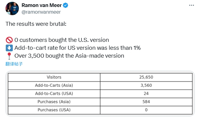 据其统计,在试验期间,共有约2.5万名美国消费者浏览了购买页面,其中3560人将“亚洲制造”版本加入购物车,584人完成购买;而“美国制造”版本仅有24人加购,却无一人真正下单。