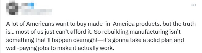 “事实是,大多数美国人根本买不起美国制造产品。因此,重建制造业并非一朝一夕之功——它需要完善的计划和高薪就业才能真正发挥作用。”