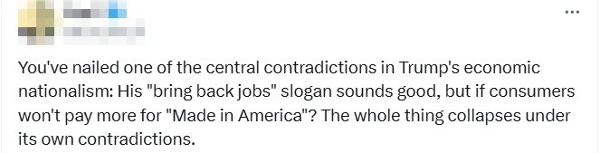 “你抓住了特朗普经济民族主义的一个核心矛盾:他的‘带回就业’口号听着好听,但如果消费者不愿意为“美国制造”支付更多的钱,整件事就会因其自身矛盾而崩溃。”