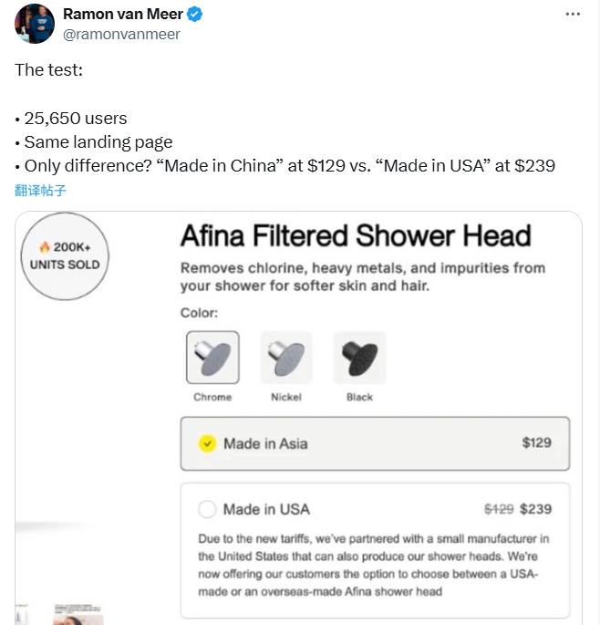 随后,他设计了这场实验。他找到了一家总部位于美国的供应商生产同款过滤淋浴喷头,由于生产成本要比在中国制造时高出近3倍,为了保持利润率,他们必须将这款美国制造产品的定价提高至239美元。相较129美元的“亚洲制造”版本,价格近乎翻番。