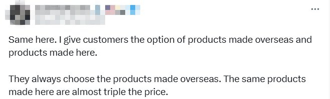 一名ID带有美国国旗和“鹰”表情符号的网民写道,“我也给顾客提供海外生产和本地生产的产品选择。他们总是选择海外生产的产品。本土制产品的价格几乎是海外制造的三倍。”