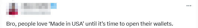 在社媒平台X上发帖公布实验结果时,他感慨道,即便美国制造业愿意让制造业回流,但面对高昂的价格,美国消费者并不愿意承担这些在美国制造而多出的额外成本,而且这并不是他们一家所面临的困境。