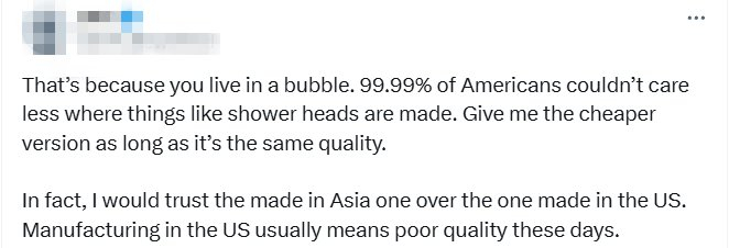 “99.99%的美国人根本不在乎像淋浴喷头这种产品的产地。只要质量一样,就给我便宜的那个。事实上,我更相信亚洲制造的,而不是美国制造的。如今,美国制造通常意味着劣质产品。”