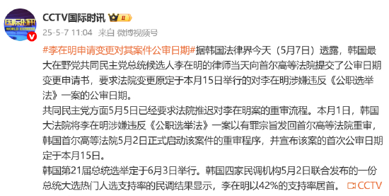 共同民主党方面5月5日已经要求法院推迟对李在明案的重审流程。本月1日,韩国大法院将李在明涉嫌违反《公职选举法》一案以有罪宗旨发回首尔高等法院重审,韩国首尔高等法院5月2日正式启动该案件的重审程序,并宣布该案的首次公审日期定于本月15日。