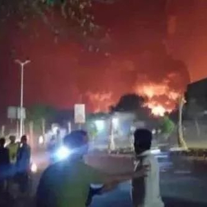 当地时间5月5日,也门荷台达省一家水泥厂遭到以色列空袭后燃起大火