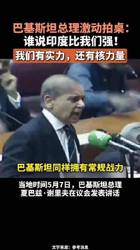 巴基斯坦总理谢里夫发表讲话时激动拍桌,称“巴基斯坦有实力还有核武器”。谢里夫表示,那些过去曾说印度在常规战争方面已把巴基斯坦远远甩在后面的人,昨晚他们清醒过来了,他们现在知道,巴基斯坦在常规作战方面也有实力。谢里夫在议会上回应印度7日的导弹袭击,称已准备好“将敌军战机击落到大海”。另外谢里夫呼吁国际社会正视印度在该地区的破坏性角色。