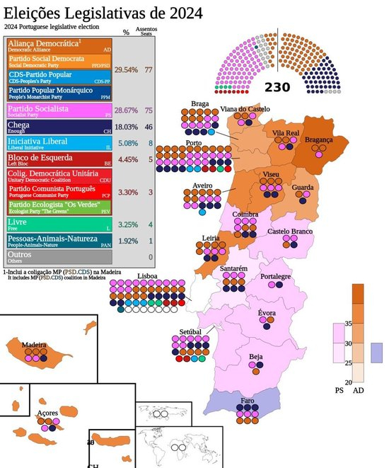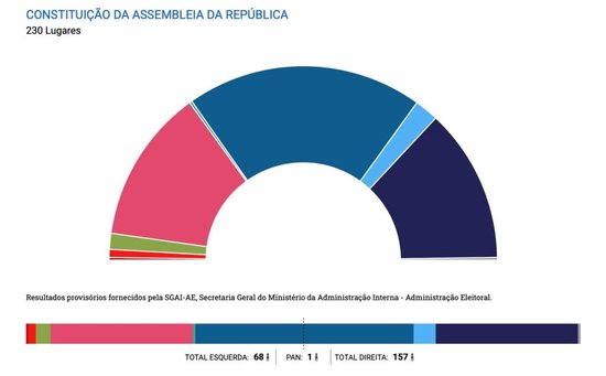 5月18日,葡萄牙举行三年来第三次议会选举。官方统计结果显示:中右翼执政党民主联盟(由社会民主党主导)获得议会230席中最多的89席,但不足以单独组建多数政府;中左翼社会党与极右翼“够了”党此消彼长、一忧一喜,都获得58席——待到海外选区4个议席归属确定,后者甚至可能反超前者,成为议会第二大党。