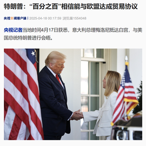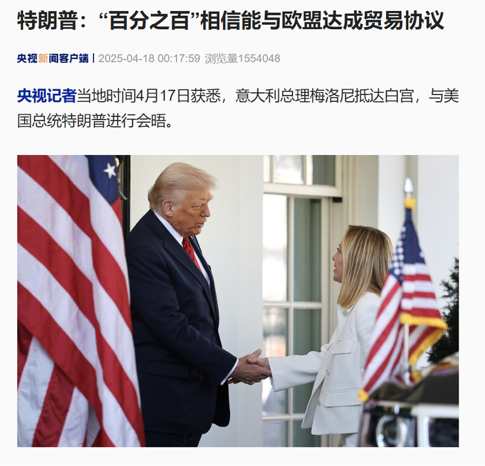 当现场记者提问特朗普,对与意大利达成贸易协议有多大信心时,特朗普用口型回答道:“非常有信心”。特朗普当天表示,“百分之百”有信心在90天的关税暂停期结束前与欧盟达成贸易协议。