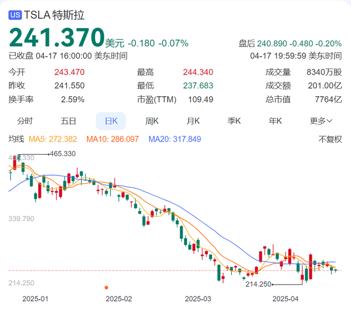 特斯拉股价又开始连续下跌,自当地时间4月9日特朗普所谓“对等关税”生效至16日一周间总市值蒸发了近1000亿美元(约合人民币7200亿元)。