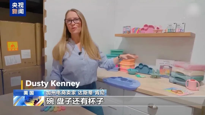 加州电商卖家 达斯蒂·肯尼:我们的产品包括婴儿勺子、餐垫、饭盒、碗、盘子还有杯子,这些产品都是在中国生产的。它们被装在这些箱子里,通过海运运到这里。我们这个仓库里有成千上万件产品,要给所有这些产品都加征关税的话,还得尽量自己承担这笔费用以免给顾客涨价。这可就是一笔天文数字了。这可是我的生计啊,我们家就靠这个吃饭,(加征)关税可能让我失业。