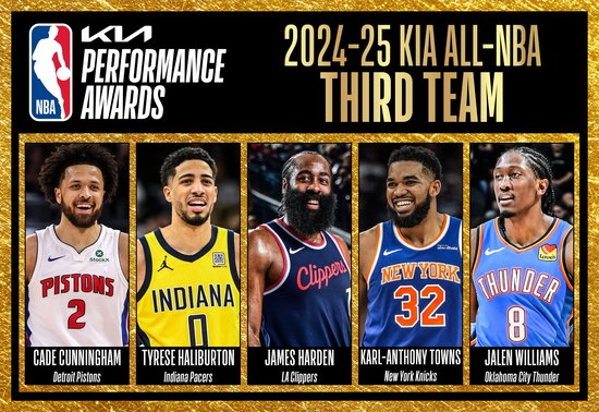 🌟最佳阵容三阵:康宁汉姆、哈利伯顿、哈登、唐斯、杰伦-威廉姆斯