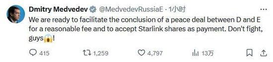 梅德韦杰夫在X平台上写道:“我们准备好促成D(唐纳德·特朗普)和E(埃隆·马斯克)之间的和平协议,收取合理的费用,并接受‘星链’股份作为付款方式。别打啦,伙计们!”