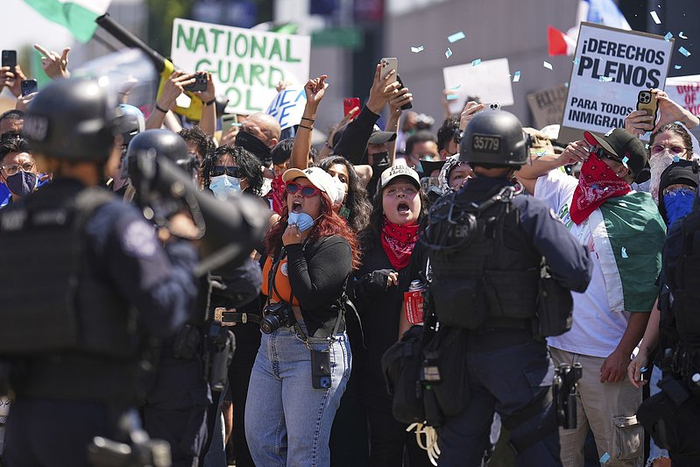 在7日晚的移民突袭抗议活动后,洛杉矶的抗议者与警方对峙。 视觉中国