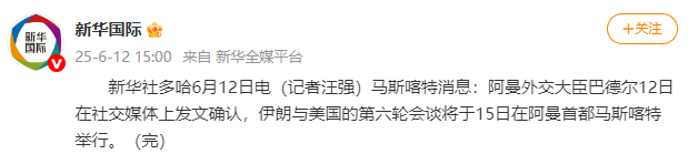 新华社多哈6月12日电(记者汪强)马斯喀特消息:阿曼外交大臣巴德尔12日在社交媒体上发文确认,伊朗与美国的第六轮会谈将于15日在阿曼首都马斯喀特举行。
