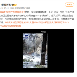 据印度媒体报道,今天(6月12日)下午在印度艾哈迈达巴德失事的印度航空公司波音787“梦想客机”,起飞后不久便坠毁在机场附近一所医学院的本科生宿舍。有报道称坠机造成地面人员受伤,但具体伤亡情况不明。(CCTV国际时讯)
