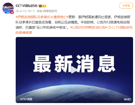 #伊朗武装部队总参谋长未遭袭身亡#更新:据伊朗国家通讯社报道,伊朗武装部队总参谋长巴盖里还活着,目前正在战情室。早些时候,以色列12频道电视台报道称,巴盖里“在以军的袭击中丧生”。#以色列对伊朗发动打击#