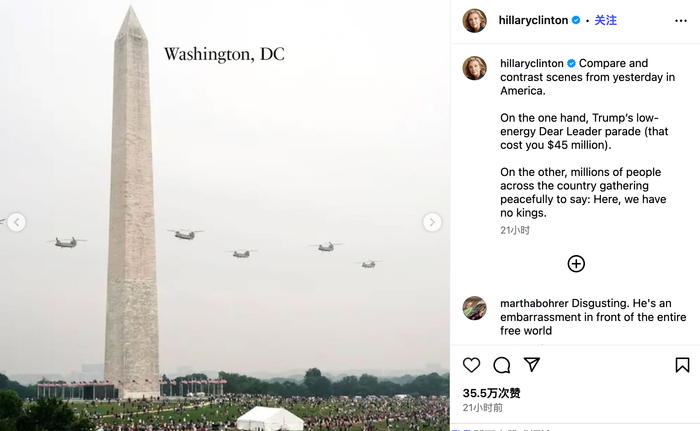 “对比一下美国昨天的场景。一方面是特朗普低能量的‘亲爱的领袖’阅兵式(耗资4500万美元)。另一方面,全国各地数百万人举行和平集会,以表示:在这里,我们不要国王”,希拉里配文称。