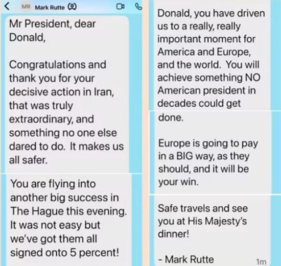 特朗普将这一私信“晒”在其自创的社交平台“真相社交”(Truth Social)上。根据截屏,吕特恭维道,“祝贺您在伊朗的决定性行动,这非同寻常,是其他人都不敢做的事情”。