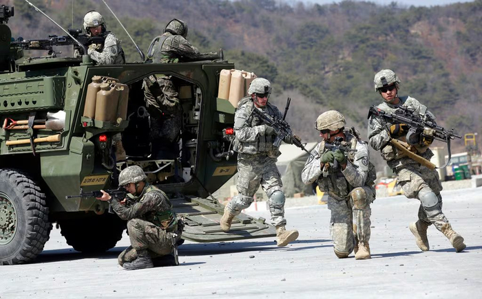 驻韩美军士兵和韩军士兵共同参加美韩联合演习 美联社