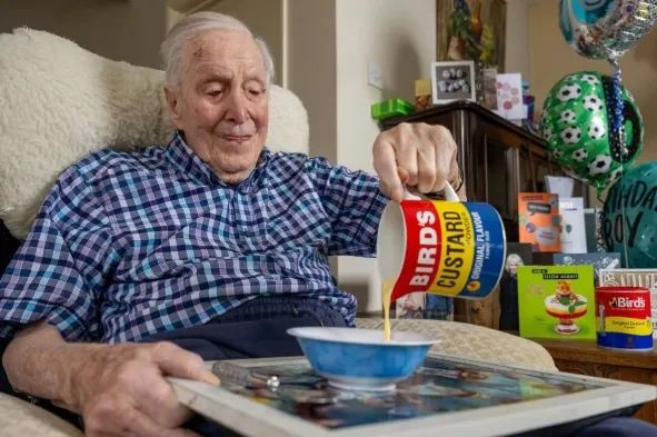 令人惊讶的是,这位百岁老人至今身体硬朗,自称“没有病痛、不吃药、不看医生”。除了最爱的布丁之外,他也喜欢炸鱼薯条。