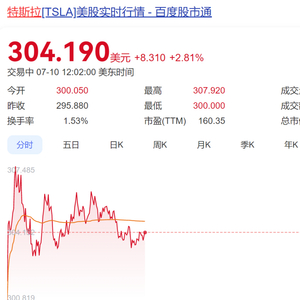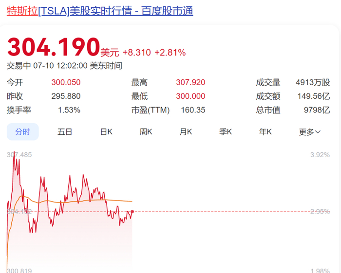 当地时间7月10日,特斯拉股价大涨,一度涨近4%,截至发稿,报304.19美元/股,涨2.81%。