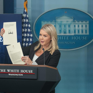 7月7日,白宫新闻发言人卡罗琳·莱维特在记者会上展示美国总统特朗普致韩国总统的信函。图源:新华社