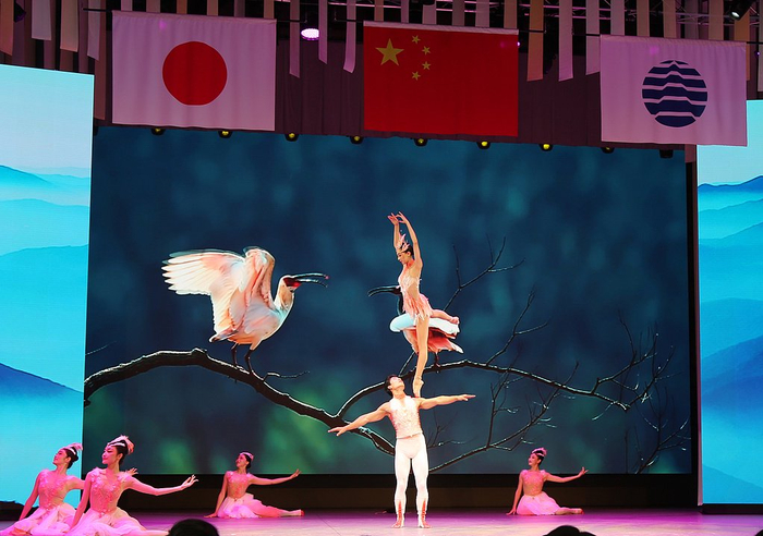 “现场有身穿传统服饰的女性演奏二胡,还有舞蹈和以象征日中友好的朱鹮为主题的表演。”日本共同社报道称。《日本经济新闻》提到,当以朱鹮为主题的杂技表演亮相时,观众席响起热烈掌声。日本时事通讯社则关注到,演出最后,中国歌手演唱了日本人气组合SMAP的热门歌曲《世界唯一的花》,让现场沸腾。