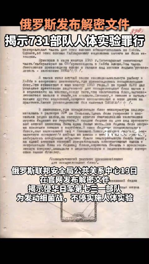 据新华社报道,俄罗斯联邦安全局公共关系中心19日在该局官网发布的解密文件显示,侵华日军第七三一部队(简称731部队)为发动细菌战,不停实施人体实验,甚至用携带病菌的炮弹攻击数百名中国人,以计算感染率、确定致病菌“质量”。