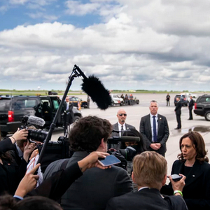 2022年,时任美国副总统的哈里斯在机场接受媒体采访,身后为特勤局安保人员。图源:美媒