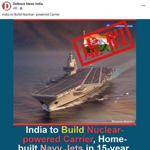 数日后,名为“Defence News India”的Facebook账号发布了这一消息,并附上了一张所谓“核动力航母”的宣传照片。