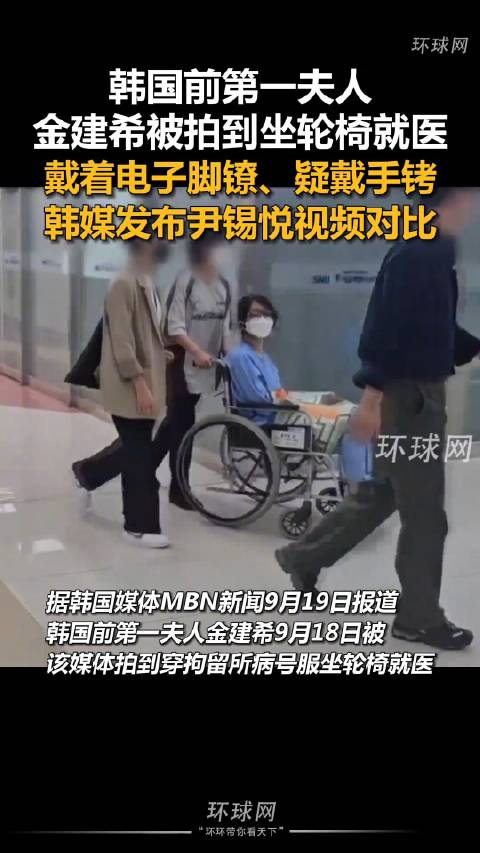 据环球网援引韩国媒体MBN新闻9月19日报道,韩国前第一夫人金建希9月18日被拍到穿着拘留所病号服坐轮椅就医。她戴着电子脚镣,双手被毛毯盖住,疑似戴着手铐。其律师团队称,就医原因为“严重低血压”。