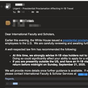 此外,某科技大厂的员工也对第一财经表达了类似的观点,并称其公司HR也在当晚9点左右向员工发送了邮件,要求H-1B签证持有人不要离开美国。