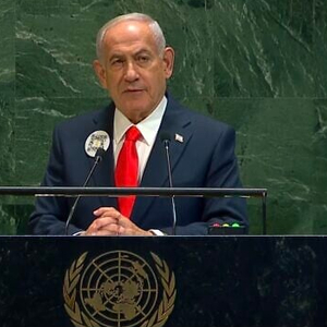 当地时间9月26日上午,以色列总理内塔尼亚胡在第80届联合国大会一般性辩论发言。