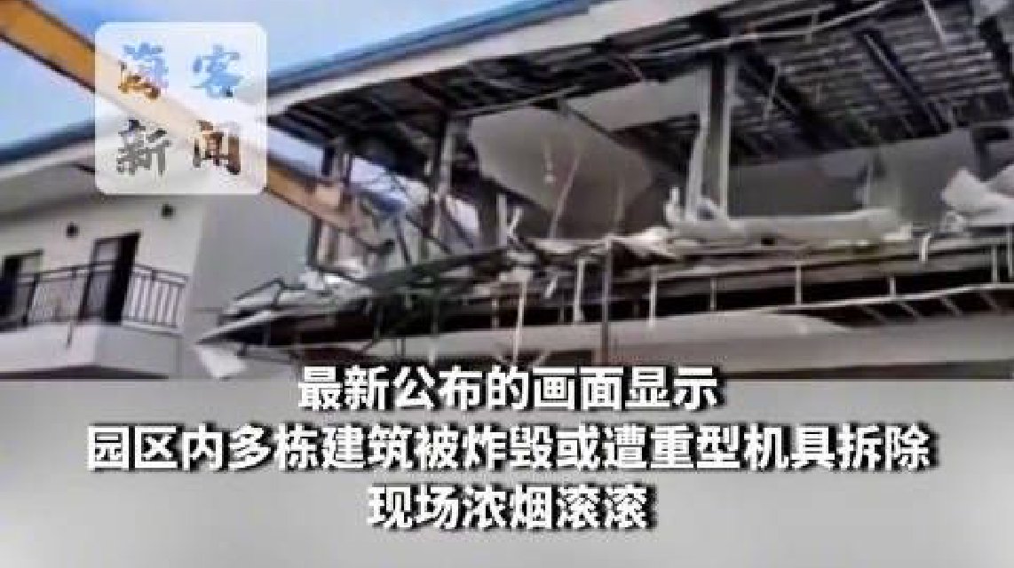 最新公布的画面显示,园区内多栋建筑被炸毁,或遭重型机具拆除,现场浓烟滚滚。