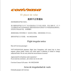 1月3日下午,委内瑞拉康维亚萨航空发布航班取消通知:由于不可抗力因素,原计划于2026年1月5日3点起飞的V0771航班由广州飞往加拉加斯已被取消。