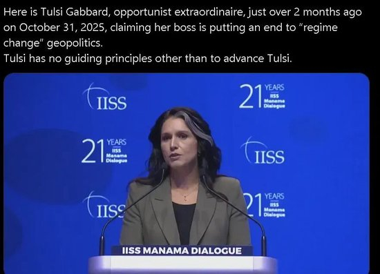 而更为讽刺的是,就在2025年10月31日,已经成为特朗普政府情报总监的加巴德,还在一段公开发言中信誓旦旦地表示,特朗普政府正在给美国动辄就让别国政权出现更迭的外交政策画上终止符。