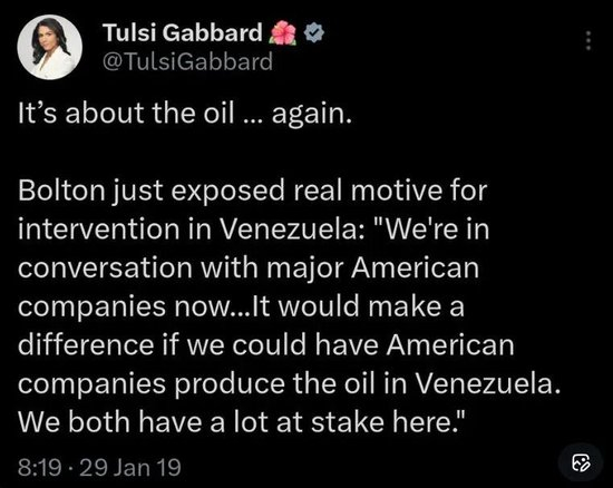 而在一则5天后的帖文中,她又批评说,美国政府想干涉委内瑞拉的目的是为了控制该国的石油。